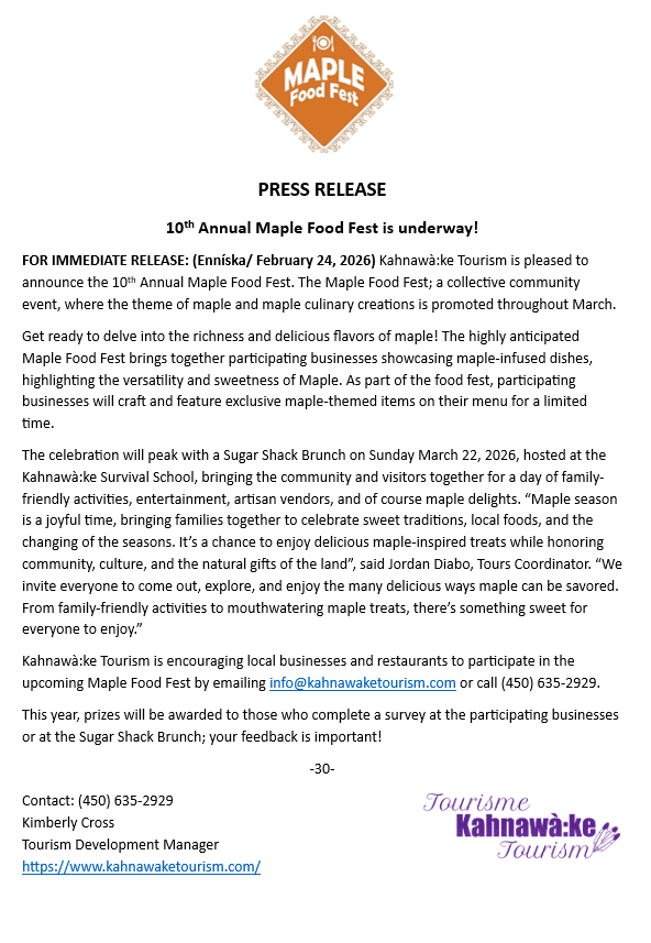 FOR IMMEDIATE RELEASE: (Enníska / February 24, 2026) Kahnawà:ke Tourism is pleased to announce the 10th Annual Maple Food Fest. The Maple Food Fest is a collective community event, where the theme of maple and maple culinary creations is promoted throughout March.